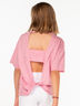 Круглый вырез и спущенные удлинённые рукава. Эко-принт и вырезы на спине. Надпись "Save oceans" переводится как "Спасти океаны".