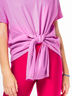 Ярко-розовая футболка со спущенным рукавом и узлом спереди – актуальная модель для создания трендового образа.