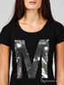 Однотонная трикотажная футболка, украшенная аппликацией в виде буквы "М" из пайеток.