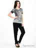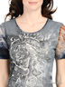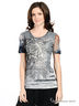 Детали: круглый вырез; короткий рукав; оригинальный принт; спинка и рукава выполнены из фактурного трикотажа