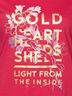 Футболка женская небольшого объема с аккуратным втачным рукавом и пластичным металлизированным принтом с золотом и перламутром. Перевод Золотое сердце светится изнутри.