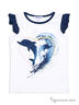 Замечательная футболка с короткими рукавами и округлым вырезом горловины. Спереди модель декорирована контрастным принтом. Рукава украшены рюшами.