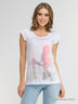 Футболка - незаменимая вещь в базовом гардеробе любой современной девушки. Модель с округлым вырезом горловины и короткими рукавами. Оригинальный принт украшает изделие.