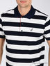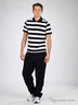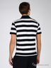 Футболка поло в бело-синюю полоску. Изготовлена с применением лайкры. Этот материал обеспечивает свободу движения и сохраняет форму, а также препятствует образованию складок. Лайкра пропускает воздух и хорошо стирается.