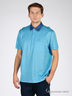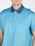 Футболка-поло ярко-голубого цвета из трикотажа пике с элегантным лоском. Отложной воротник из денима. Планка-застежка на пуговицах в полоску. Короткие рукава. На полочке накладной карман.