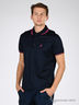 Трикотажная футболка-поло насыщенного темно-синего цвета с элегантным лоском. Отложной воротник с розовыми полосками. Планка-застежка на пуговицах. Короткие рукава с манжетами.