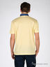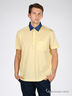 Футболка-поло желтого цвета из трикотажа пике с элегантным лоском. Отложной воротник из денима. Планка-застежка на пуговицах в полоску. Короткие рукава. На полочке накладной карман.