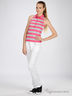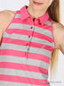 Трикотажная футболка-поло без рукавов из натурального 100% хлопка. Отложной воротник на стойке. На полочке планка-застежка на пуговицах. Футболка декорирована люрексом. Комфортная и стильная модель.