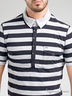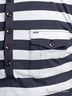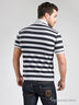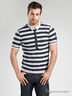 Мужская рубашка-поло в черно-серую горизонтальную полоску. Планка-застежка на пяти пуговицах. Отложной воротник. Накладной нагрудный карман с клапаном, застегивающийся на пуговицу. Кокетка на спинке изделия. Левый рукав декорирован аппликацией.