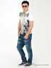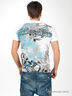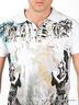 Рубашка-поло, классического кроя из трикотажа-пике. Короткий рукав с манжетой в виде резинки. Отложной воротник. Спереди застежка на пуговицах. По бокам небольшие разрезы. Спереди, с внутренней стороны, выполнен маленький карман. Футболка декорирована необычным, цветным принтом и металлическими клепками.