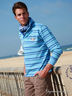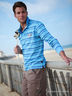Футболка-поло с длинными рукавами из джерси в полоску, края в рубчик, низ планки + изнанка основания воротника + низ воротника + кокетка сзади + кант голубого цвета, низ планки + кант на основании воротника синего цвета, вышивка с принтом на груди + нашивка, боковые разрезы, пришитая нашивка вверху разреза.