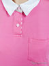 Однотонная футболка-поло из трикотажа стрейч. 2 пуговицы, белый воротник, серое основание воротника, планка в полоску с отстрочкой "зигзаг" + нашивка сбоку и нагрудный карман. Боковые разрезы 6 см для размер. 50-52