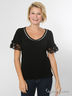 Потрясающая футболка с коротким рукавом и округлым вырезом горловины. Рукав окантован кружевом. Отличный вариант для создания стильного образа.