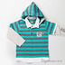 Приталенная модель с длинным рукавом и капюшоном. За счет ворота, рукавов и низа изделия создается эффект "тройки" - рубашки, футболки и кофты с длинным рукавом. "Футболка" застегивается на три пуговицы, "рубашка" - также на три. Рукава рубашки на пуговице. Декоративные нашивки на полочке, аппликация на рукаве и капюшоне.