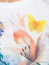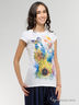 Футболка креативного исполнения - находка для современной женщины, желающей оставаться самой собой. Модель немного свободного покроя, украшена печатным рисунком на груди. Вырез горловины округлый, короткие рукава.