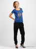 Очаровательная трикотажная футболка синего цвета из приятного на ощупь материала. Широкая круглая горловина. Короткие рукава. Забавные бархатистый принт на полочке.