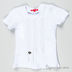 Детали: округлый вырез горловины, короткий прямой рукав, полочка декорирована вышивкой с гофре и цепочками.
