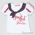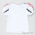 Детали: округлый вырез горловины, короткий рукав декорирован рюшами, полочка декорирована набивным рисунком и стразами.