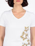 Легкая трикотажная футболка. Классический крой. Короткий рукав. V-образный вырез горловины оформлен трикотажной резинкой. Изделие декорировано вышивкой пайетками, стразами и рисунком-принтом.