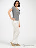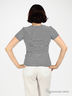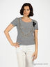 Футболка из мягчайшего трикотажа. Широкий округлый вырез оформлен трикотажной резинкой. Короткий рукав. Полочка изделия украшена рисунком-принтом и подвесками в виде морских животных. В дополнение к изделию идет брошь в виде банта со стразиком.