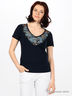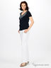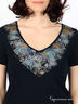Детали: V-образный вырез горловины, короткий рукав, полочка декорирована аппликацией и стразами