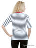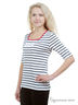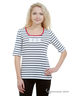 Футболка с рукавами до локтя из трикотажа в полоску и в рубчик 1x1, контрастный красный кант по вырезу горловины, 2 однотонные нашивки + стразы и 1 нашивка с рыбкой из страз. Боковые разрезы 6 см для размер. 50-52