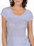 Приталенная трикотажная футболка из легкого материала. Спинка и полочка украшены принтом и стразами.