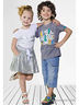 Футболка для девочки, изготовлена из хлопка белого цвета. Модель декорирована серебристым принтом и светлыми стразами.