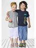Футболка для мальчика, изготовлена из хлопка темно-серого цвета. Декорирована белыми манжетами и вертикальной желто-бирюзовой надписью.
