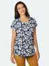 Элегантная футболка из струящегося вискозного трикотажного полотна, запринтованного футуристическим принтом. Изделие полуприлегающего силуэта с удлиненным цельнокроеным рукавом.
