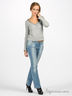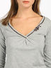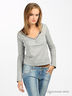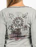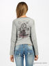 Женская футболка из хлопка с длинным прямым рукавом. Широкий V-образный вырез горловины декорирован стеклярусом. На спинке аппликация. Рукав дополнен широкой манжетой.