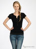 Приталенная трикотажная футболка. Круглая горловина. Короткие рукава. На полочке планка-застежна на пуговицах. Украшена контрастной прострочкой.