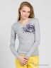 Женская трикотажная футболка с длинными рукавами. Круглая горловина. Спереди футболка украшена набивным рисунком.