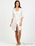Детали: топ - тонкие бретели регулируются по длине; декорирован вышивкой; застегивается на планку с пуговицами, дополненную кружевными оборками; шорты - посажены на резинку; декорированы принтом и кружевными вставками; халат - рукав 3/4 с кружевными оборками; два накладных кармана; в шлевки продет пояс; оригинальный принт
