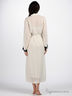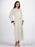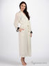 Женский халат средней длины из шелкового шифона. Рукав длинный, украшены кружевом. Талия подчеркнута поясом.