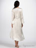 Женский халат средней длины из атласного шелка, отделанный изящным кружевом, на завязках. Рукав длинный.