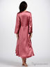 Женский халат средней длины из атласного шелка, отделанный изящным кружевом, на завязках. Рукав длинный.