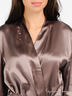 Детали: v-образный вырез горловины с запахом, длинный рукав оторочен кружевом, два кармана, в шлевки продет пояс