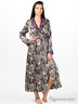 Длинный струящийся халат с запахом выполнен из легкой ткани с атласным блеском и принтом «классический огурец». Удлиненный отложной воротник и манжеты рукавов отделаны тканью фиолетового цвета с принтом «горох». В боковых швах — прорезные карманы. Съемный пояс продет в шлевки для Вашего удобства.