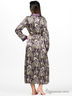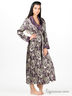 Длинный струящийся халат с запахом выполнен из легкой ткани с атласным блеском и принтом «классический огурец». Удлиненный отложной воротник и манжеты рукавов отделаны тканью фиолетового цвета с принтом «горох». В боковых швах — прорезные карманы. Съемный пояс продет в шлевки для Вашего удобства.