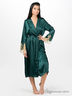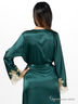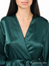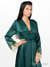 Привлекательный длинный халатик с запахом выполнен из струящейся однотонной ткани с атласным блеском. Внешний съемный пояс продет в шлевки и дополнен внутренними завязками. Справа в боковом шве — прорезной карман. Рукава декорированы изящным тонким кружевом.
