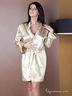 Укороченный халат с запахом под пояс из тонкой атласной ткани. Длинные, слегка расширенные к низу рукава. Низ рукавов и края полочек отделаны оборкой. По краю оборки контрастный кант.