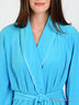 Детали: шалеобразный ворот с запахом, длинный прямой рукав, в шлевки продет пояс, два кармана, атласный кант по краям изделия