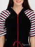 Детали: глубокий капюшон, застежка на молнию, короткий прямой рукав, пояс на кулиске с атласной лентой, два кармана