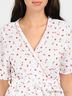 Детали: v-образный вырез горловины с запахом оторочен оборкой, короткий рукав, два кармана, в шлевки продет пояс