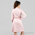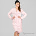 Трикотажный халатик нежно-розового цвета с запахом на внутренних завязках. Внешний пояс расположен в области талии и продет в кулиску, которая не позволит поясу упасть или потеряться. Края полочек, воротниковая зона и манжеты рукавов отделаны бархатистой резинкой и тесьмой-кружевом. Левая полочка украшена декоративной нашивкой-логтипом.