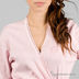 Трикотажный халатик нежно-розового цвета с запахом на внутренних завязках. Внешний пояс расположен в области талии и продет в кулиску, которая не позволит поясу упасть или потеряться. Края полочек, воротниковая зона и манжеты рукавов отделаны бархатистой резинкой и тесьмой-кружевом. Левая полочка украшена декоративной нашивкой-логтипом.