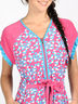 Махровый халат из натурального хлопка. V-образный вырез горловины. Короткие рукава реглан с трикотажными оборками. Застегивается на молнию. Вшитый поясок. Два втачных кармана.