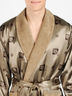 Детали: длинный рукав с отворотом; отложной ворот; завязывается на пояс с запахом; два накладных кармана; декорирован принтом