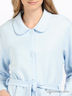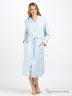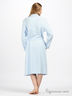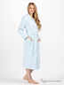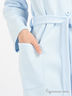 Халат прямого покроя нежно-голубого цвета из фактурного трикотажа. Отложной воротник с закругленными краями. Застегивается на пуговицы. Длинные рукава. На больших накладных кармана.